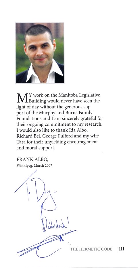 Frank tells the group that Premier Gary Doer became interested in his project and gave him "the run of the place". This led to several interesting situations with security personnel, including one time at might when he was wearing his pyjamas. Frank referred frequently to the book as he explained the concept of a sacred geometry, which the Freemasons believe to be a sacred science handed down by God. One of his discoveries was that most of Manitoba's premiers were Freemasons.