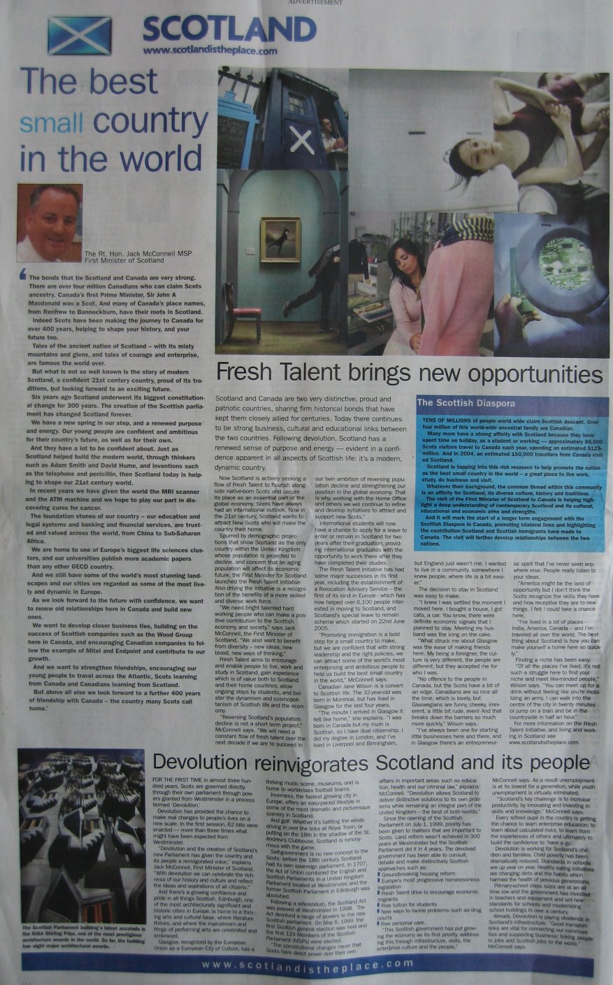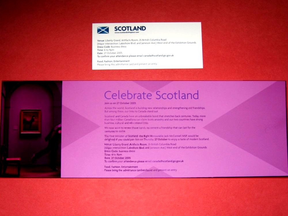 A two-page advertisement in the Globe and Mail on Thursday, October 27, 2005, covered the visit of the Honourable Jack McConnell MSP, First Minister of Scotland. Beneath this is my equally impressive invitation to the event.