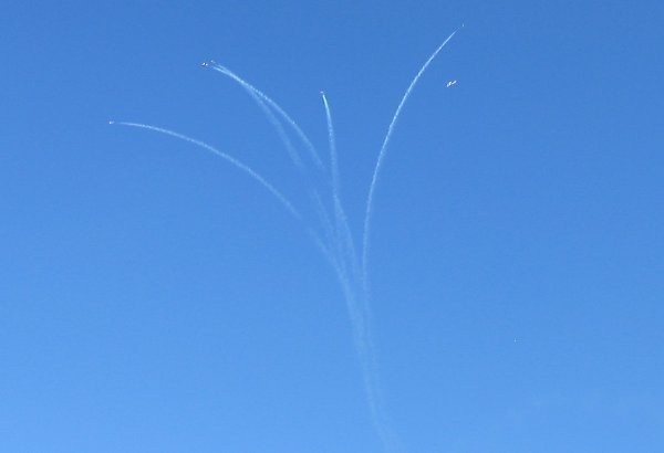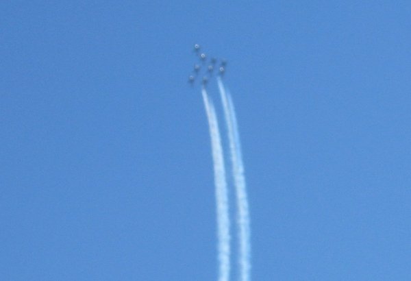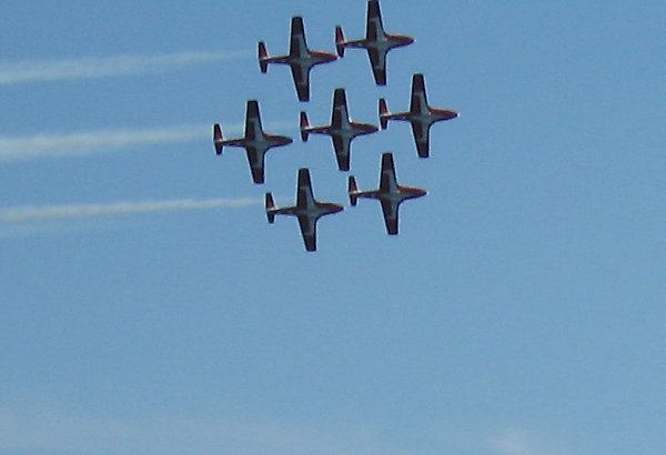 The CAF Snowbirds have provided the finale to the CNE airshow for the past 33 years, but their entrance in their CT-114 Tutor aircraft still caught me by surprise . . . which may account for the blurriness of the first photo. The other pictures were quite fortuitous! After all, they do have some 50 different formations and manoeuvres . . . including loops, solo passes, and 7 or 9 plane formations. Since there was only a slight breeze, the "starburst" and the "heart" stood out well against the blue sky.