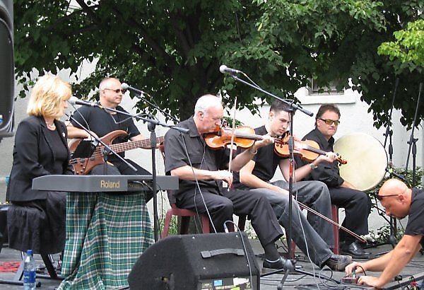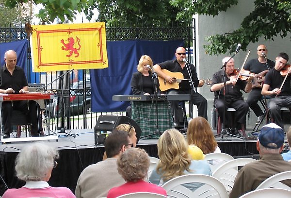 When we finally arrived at the pavilion, we discovered that there was indeed a terrific afternoon's entertainment at only $4.00 (a dollar less than the amount advertised in an email from the Scottish Studies Foundation). There were Sandy MacIntyre with his "Steeped in Tradition" band, the RSCDS Scottish Dancers, and two pipers plus a drummer from the Toronto Police Pipe Band (wearing the Dress Ross tartan, of course). I managed to down a Bridie with some Caledon Brewery ale.